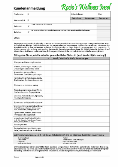 Aus versicherungstechnischen Gründen bitten wir Sie vor Anwendungsbeginn um eine Selbstauskunft zu Ihrem gesundheitlichen Status. Bestimmte Anwendungen mit Druck oder Hitze sind z. B. bei Herzleiden, Entzündungen, Schwangerschaft, uvm. nicht empfehlenswert und können zu ernsthaften Problemen führen.